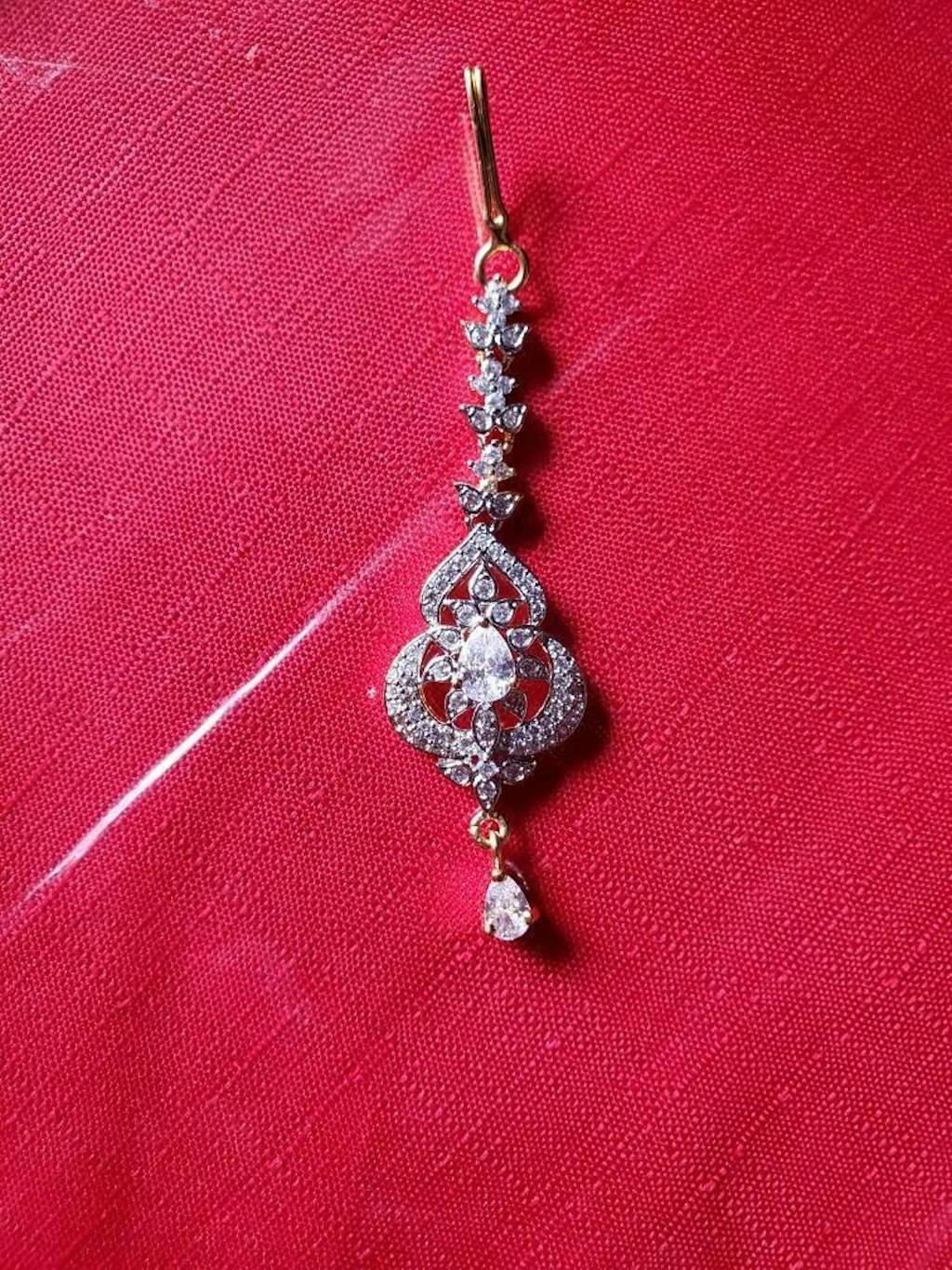 Adorn yourself with the exquisite beauty of our American Diamond Maang Tikka, crafted to captivate hearts at every celebration. This traditional ethnic jewelry piece is more than an accessory—it's a statement of cultural pride and elegance, perfect for elevating your look at weddings or festive gatherings.