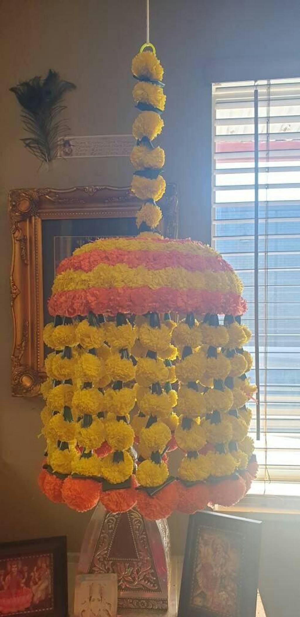 - Versatile Decoration - Artificial fluffy marigold Jhoomar for diwali, traditional indian decor, christmas decor, wedding gift, bush floral themed party, day of the dead, lohri, dia de los muertos, sankranthi, toran, pongal, dholki, new year theme parties, new year celebrations, indian party decorations, diwali decorations, wedding flowers, bollywood theme parties, pooja ghar home decor, flower party decorations, puja flower for wall backdrop or floral wall panel or staircase decorations.
