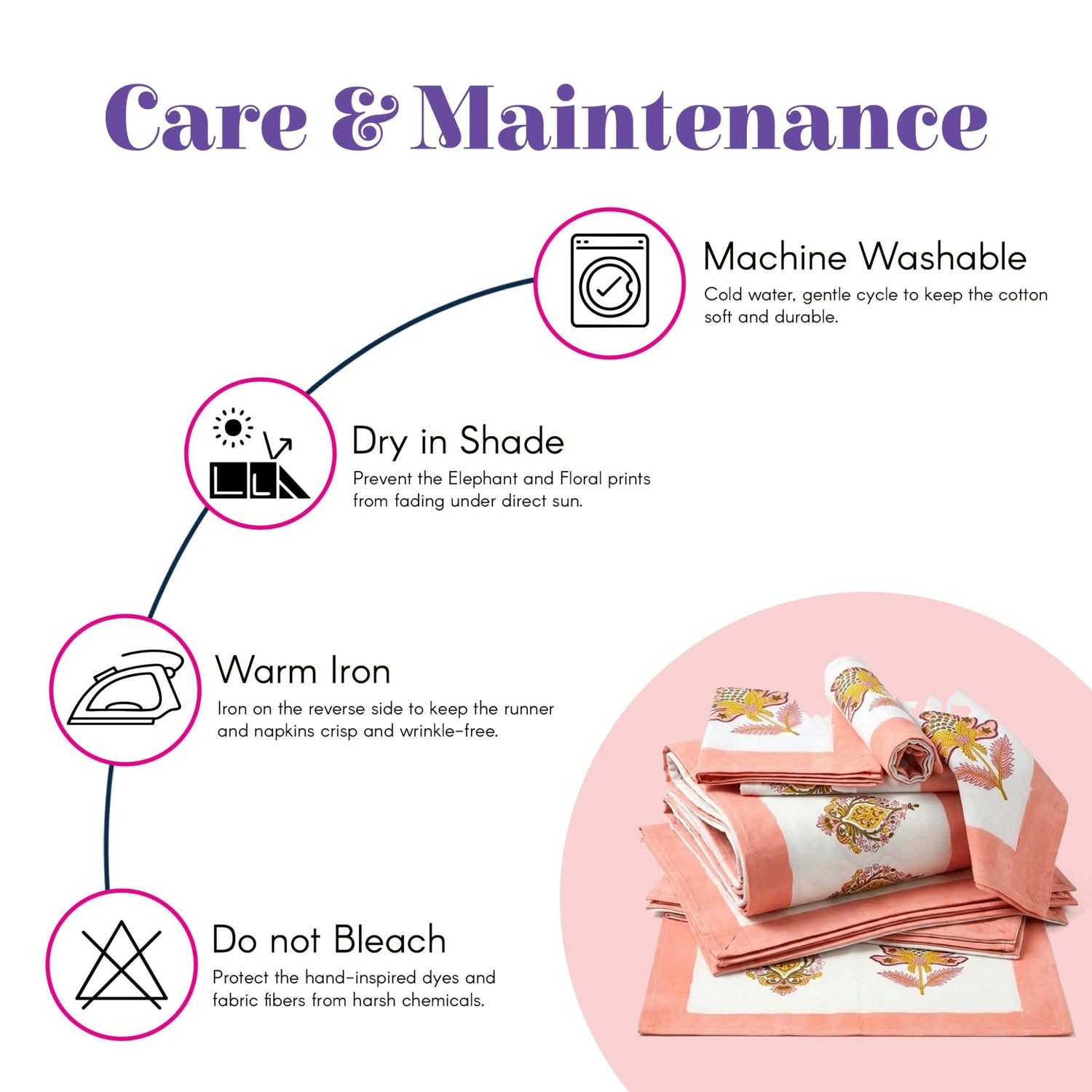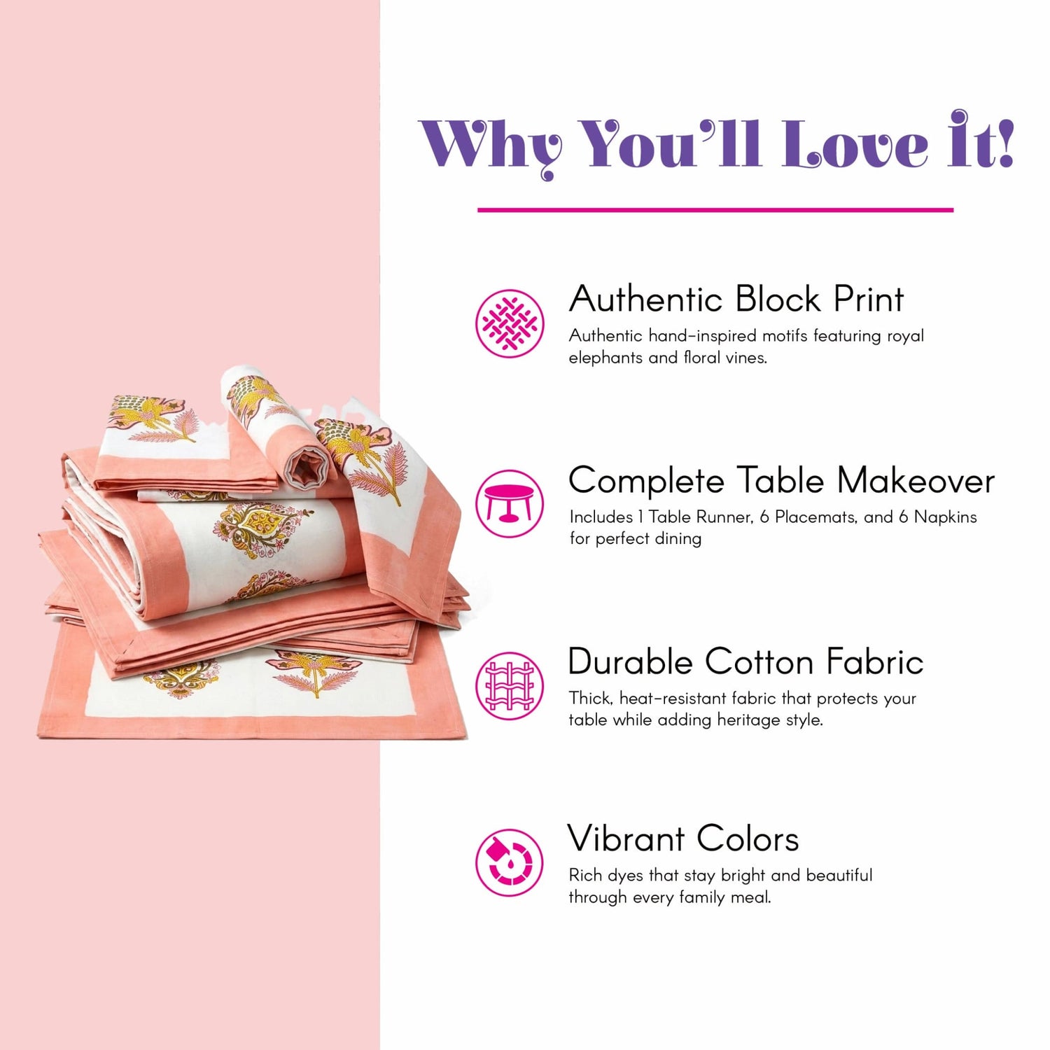 - Hand Block Artistry: This vibrant set features a long peach-bordered lotus centerpiece designed to elevate your home decor in any dining room.