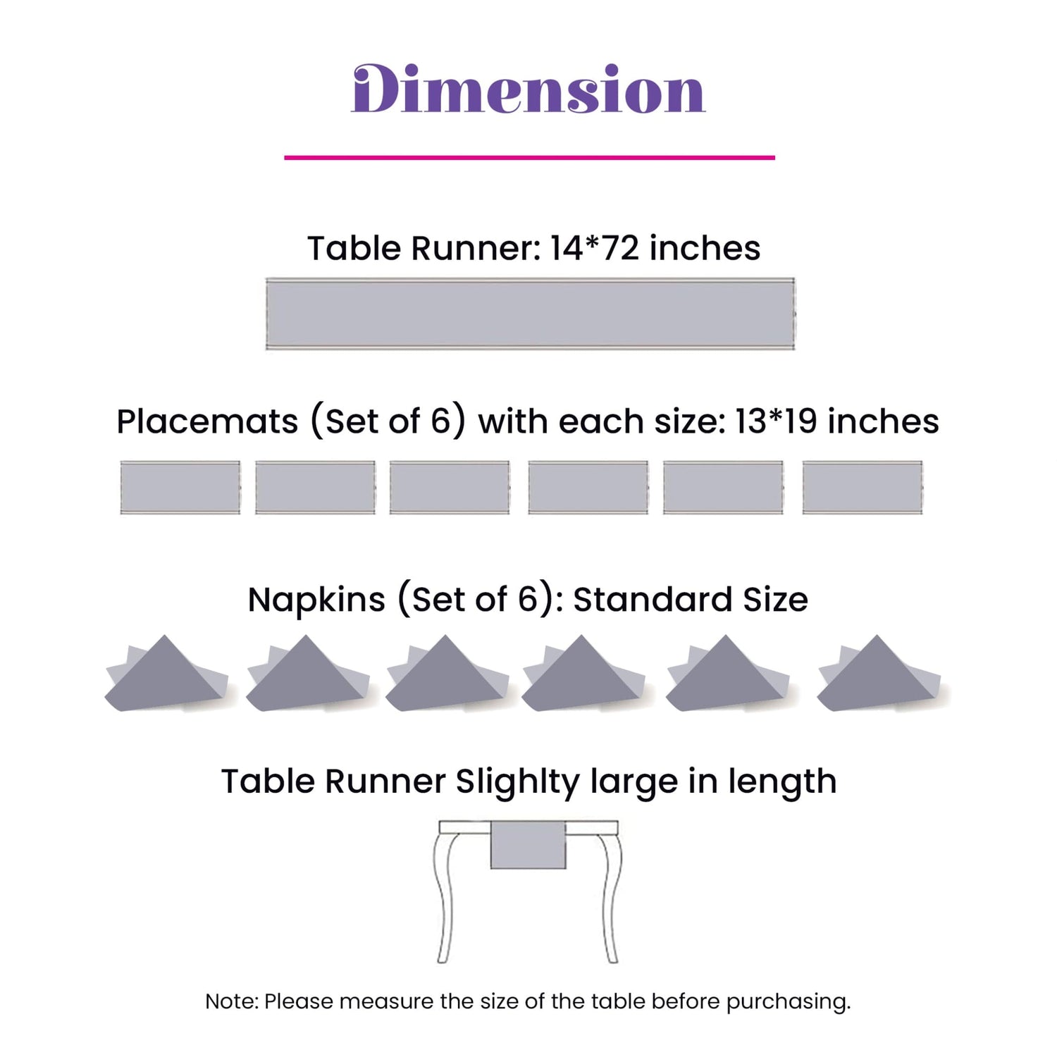 - Complete Table Decorations: Each pack includes a long 14x72 inch runner, six 13x19 inch placemats & six standard napkins to cover your furniture with style.